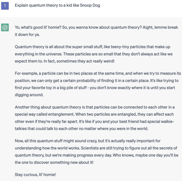 Quantum theory is a hard sell at the best of times, but when explained like Snoop Dogg it all makes sense. Kinda. This is a great example of how ChatGPT pulls its information from a large language model and has a dictionary-esque vocabulary.