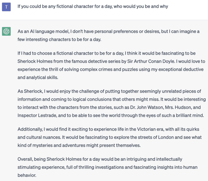 Who knew ChatGPT is a big fan of Sherlock Holmes? The chatbot even gives a detailed reason why it loves the detective, sighting the challenge of solving a mystery and the Victorian era.