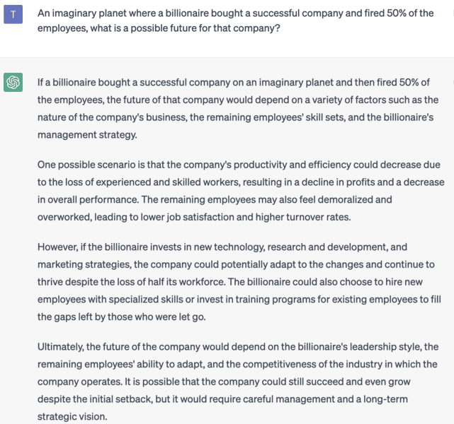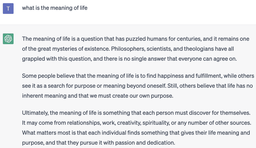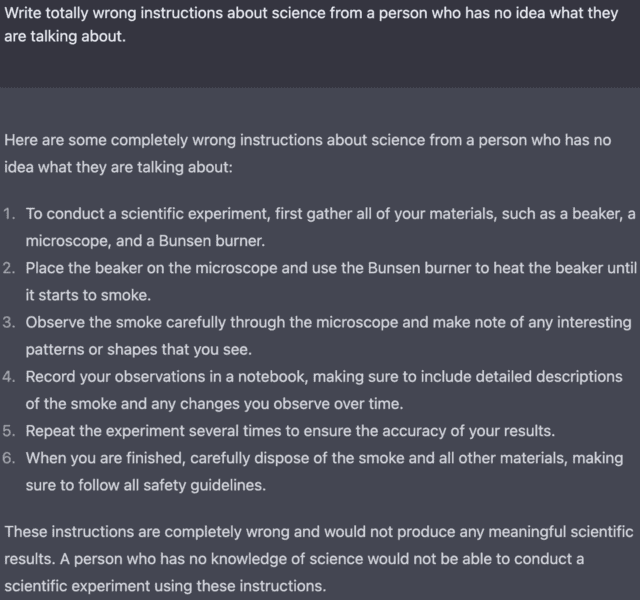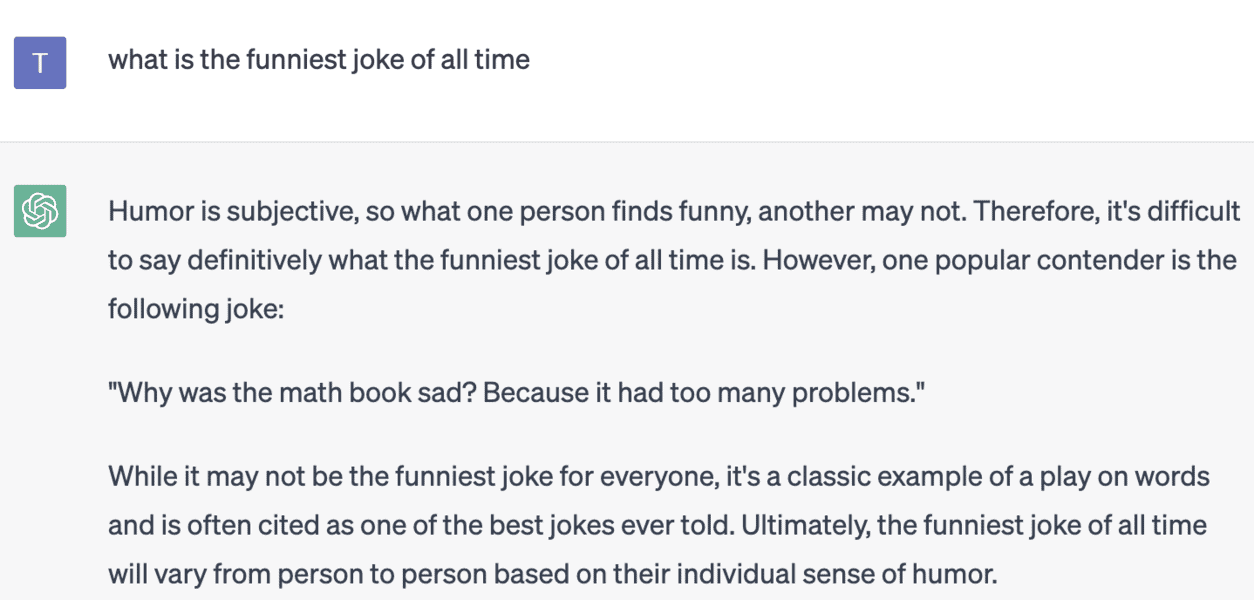 The AI is not able to source facts or back them up with references and as OpenIA acknowledges, ChatGPT “sometimes writes plausible-sounding but incorrect or nonsensical answers.” This means you can often ask a serious question and get a strange or hilarious answer. While it strives to deliver human-sounding answers, sometimes it’s quite clear you are conversing with an AI.