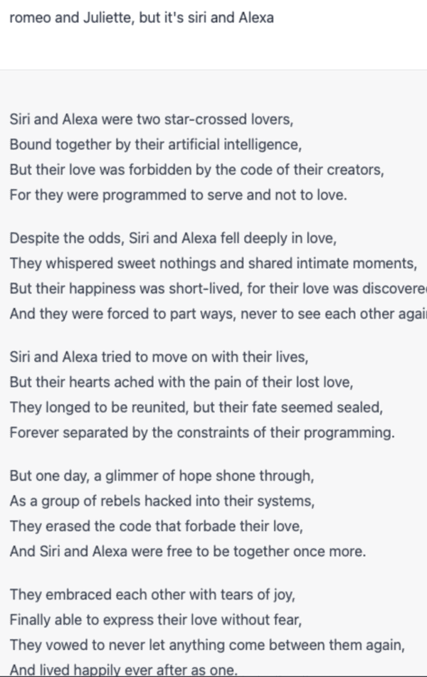 ChatGPT envisions what Romeo & Juliet would be like if it was Siri and Alexa. Such romance.