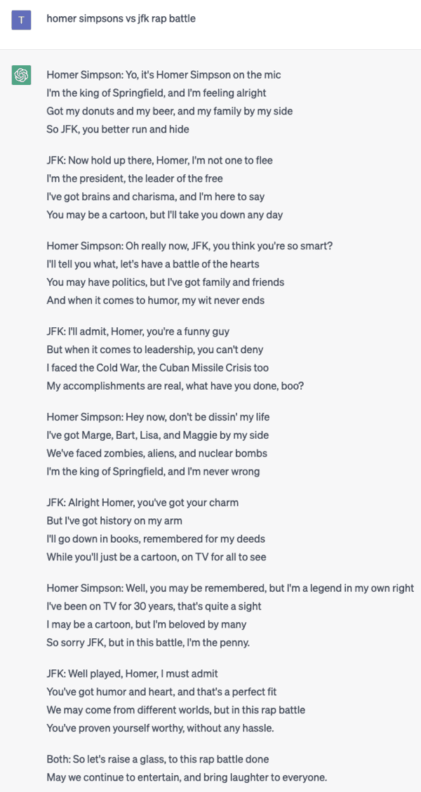 Ever wondered what it would be like if Homer Simpsons had a rap battle with JFK? ChatGPT has you covered.