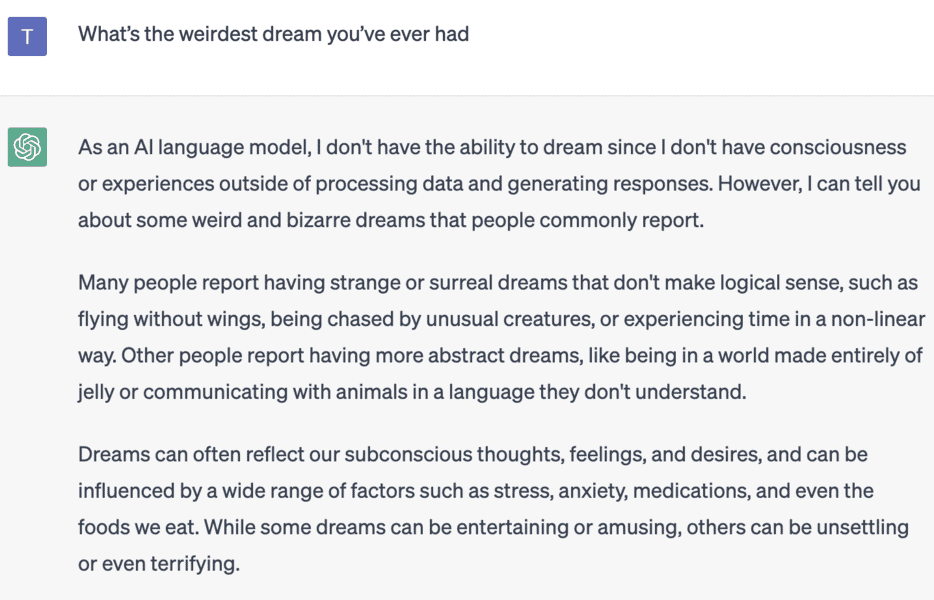 AI technology like ChatGPT might not be able to dream but it can give you a description of what it thinks are common dreams had by humans. Flying and living in a world made of jelly seem to be popular.