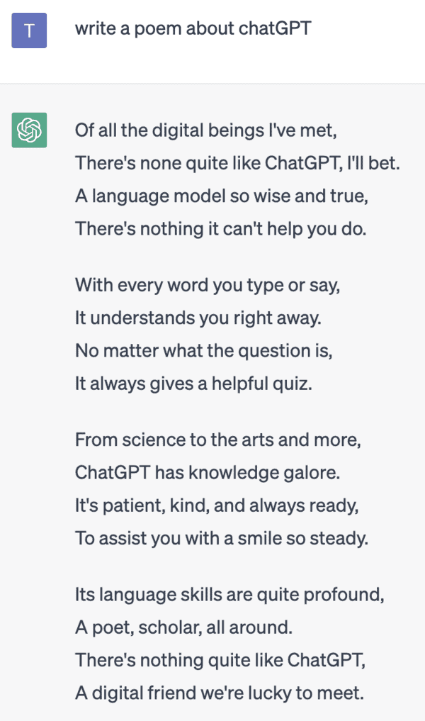 ChatGPT is really feeling itself. This poem demonstrates the AI’s creative flair while also talking itself up.