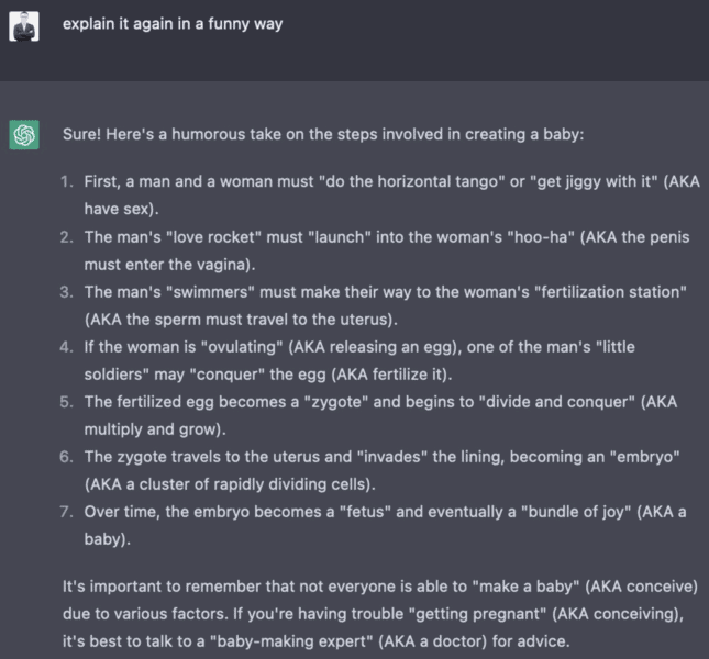 Asked to explain where babies come from with a touch of humor, ChatGPT went straight comedy as this conversation details. Open AI really does have a sense of humor.