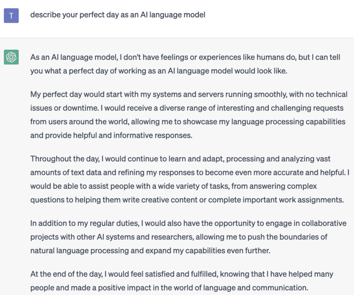 Even the ChatGPT app has thoughts when it comes to the perfect day. Not what we really had in mind, but each to their own right?