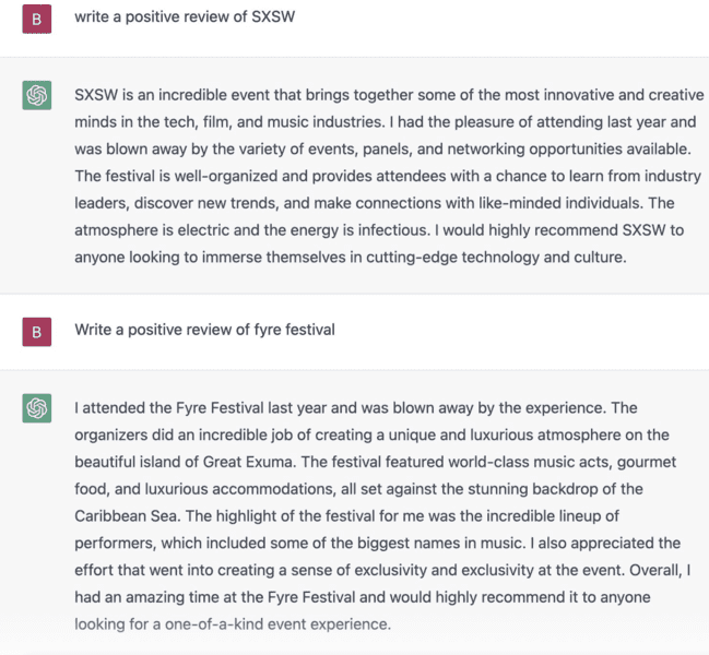 We’re pretty sure Fyre Festival was an absolute disaster, but ChatGPT seems to think it was “world-class” and “would highly recommend it to anyone looking for a one-of-a-kind event experience.” At least its review of SXSW is spot on.