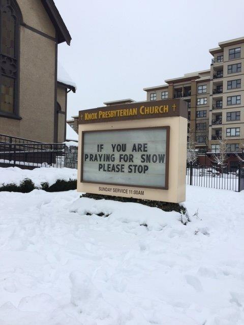 Outdoor church signs have to be quality signs as they deal with all types of weather. This sign is asking people to stop praying for the snow as it’s getting too much.