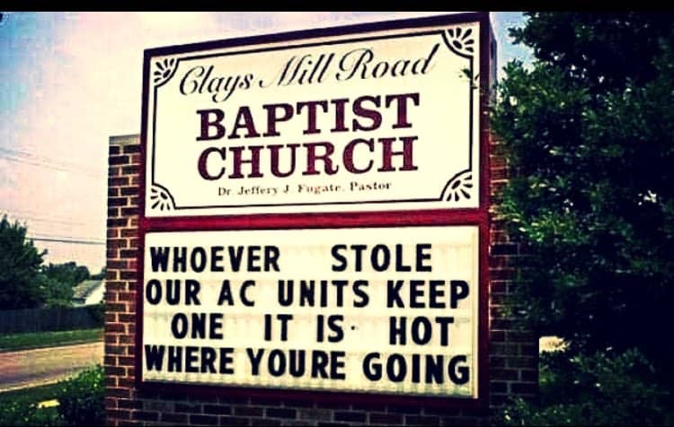 Someone stole the air conditioner from Clays Mill Road Baptist Church, but instead of getting angry, the church is just reminding the offender they’ll probably need the AC where they are going.