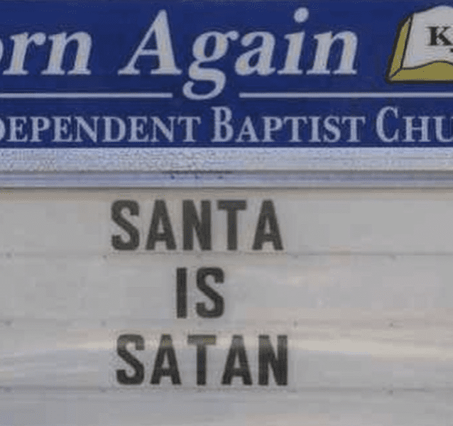 This custom sign is nice and direct. The Baptist religious organization certainly isn’t a fan of the big bearded guy.