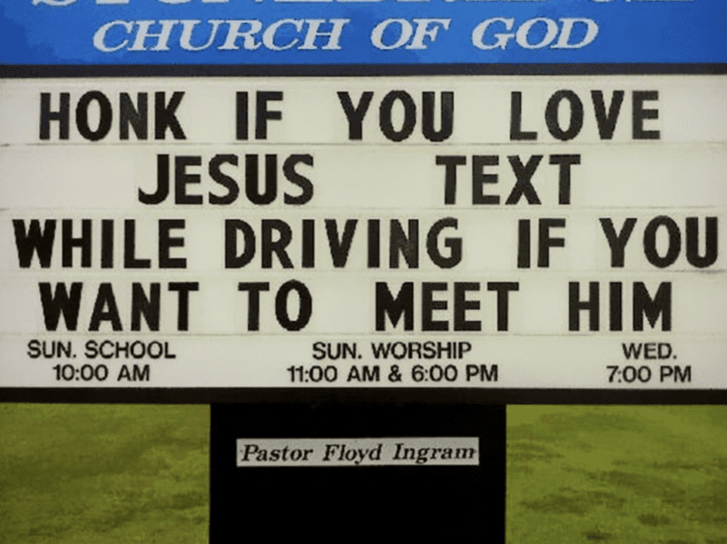 Not every sign or church banner is preaching the good word. This one acts as a safety warning not to text and drive, otherwise, you might be meeting God sooner than you imagined.