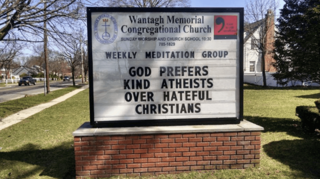 Church signs can also act as community signs. This one is from the Wantagh Memorial Congregational Church and suggests that the almighty prefers kind people that don’t believe over those who do but spread hate. Hard to disagree.