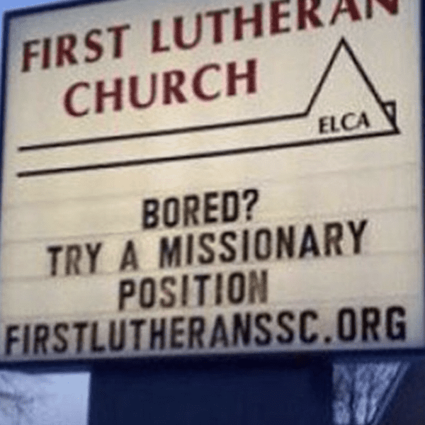 This is a very clever and slightly risque sign from the First Lutheran Church. Asking the question, “are you bored?” the church suggests trying missionary. It will have you doing a double take until you realize it’s not talking about the sex position but becoming a church missionary.