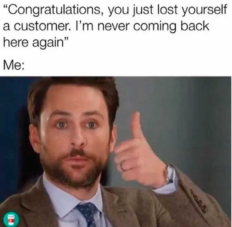 This is a more general meme that shows the emotions most retail workers feel when someone says they are “never coming back” to shop in the store again.