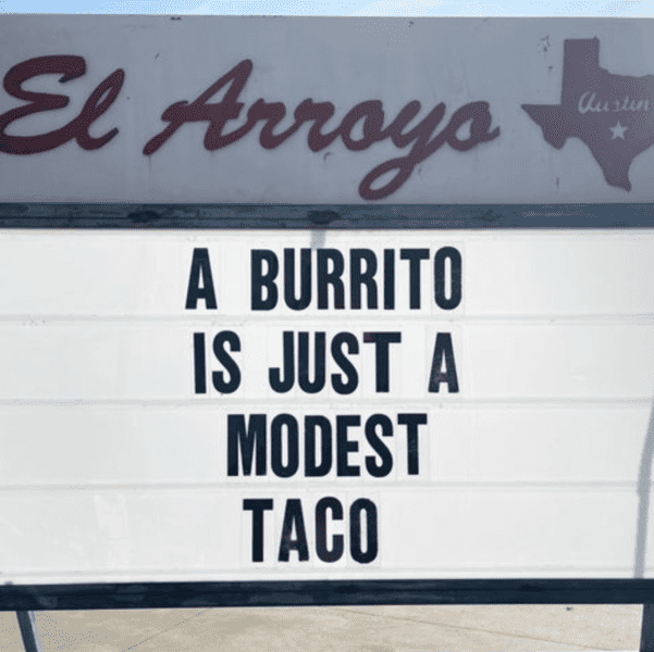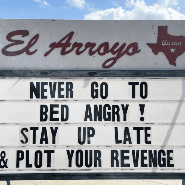 The famous Texas restaurant El Arroyo never misses an opportunity for a funny restaurant sign. Not only does El Arroyo offer the best tacos and burritos, but they also look out for customers. Instead of going to sleep angry, stay up late, plot your revenge, and order some tacos from El Arroyo.