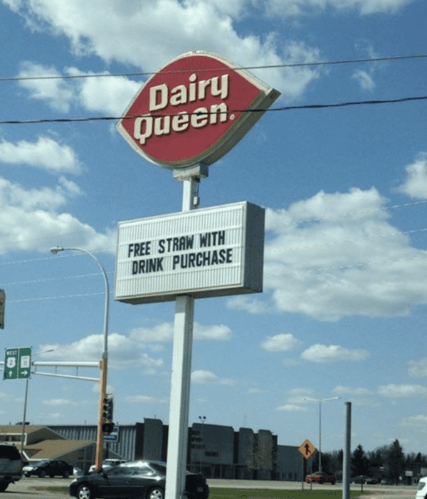 Dairy Queen isn’t just about ice cream. It’s a large franchise famous for its hilarious signs and bargains. As this sign points out, customers get a free straw with every drink they purchase. Plus, on Tuesday’s customers get two free napkins.