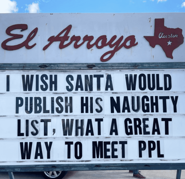 Based on El Arroyo’s hilarious signs, they might end up on Santa’s naughty list. Maybe Santa can post the naughty list on social media so they can get naughty with each other. The popular Texas restaurant has the right idea.