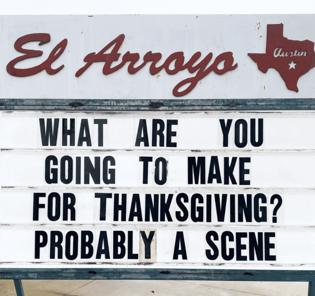 El Arroyo is the type of sign that says what we’re all thinking. Families gather every year on Thanksgiving to enjoy a delicious dinner. Some families have a tradition of making something to add to the meal.