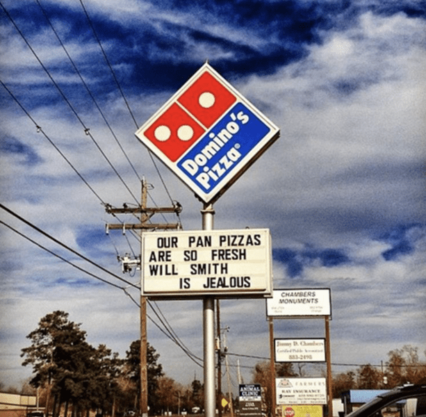 They let everyone know their pizzas are so fresh they’ll make Will jealous. He could get so jealous he’ll slap that pepperoni pizza in the face.