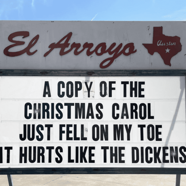 Christmas wouldn’t be the same without the classic novel Charles Dickens’s A Christmas Carol. Well, Texas wouldn’t be the same without a clever joke from El Arroyo. Anyone who reads the Christmas Carol knows how heavy it is. It truly does hurt like the Dickens.