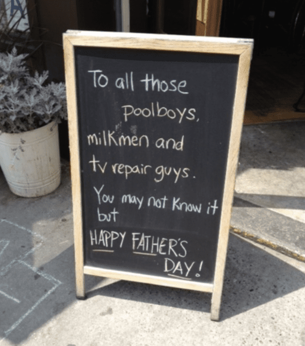 Each year, bars and restaurants pay homage to the unsung heroes on Father’s day. A funny bar sign on the sidewalk joked about the birth fathers that don’t get any credit, like the pool boys, repairmen, and infamous milkmen.