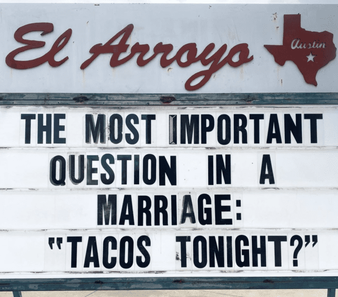 The masters of the funny restaurant sign, El Arroyo also know the importance of marketing. This restaurant sign promotes their delicious tacos and the key to a successful marriage. El Arroyo continues to raise the bar with funny signs.