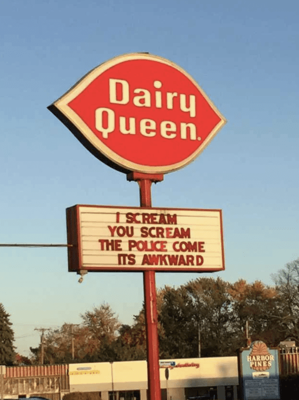 When it comes to ice cream, it’s impossible to contain the abundance of emotions a person feels. Nobody knows that better than Dairy Queen and the local police. Dairy Queen is famous for its hilarious signs. It’s safe to say nothing compares with the “I Scream, You Scream, The Police Come It’s Awkward” sign. A great twist on a classic joke.