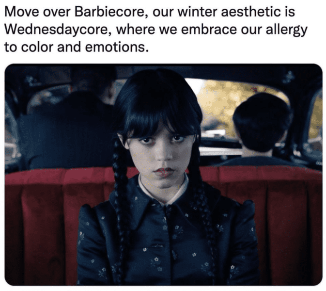 This Wednesday meme wants everyone to embrace their darker side by wearing black this winter, which just so happens to be Wednesday’s favorite color.
