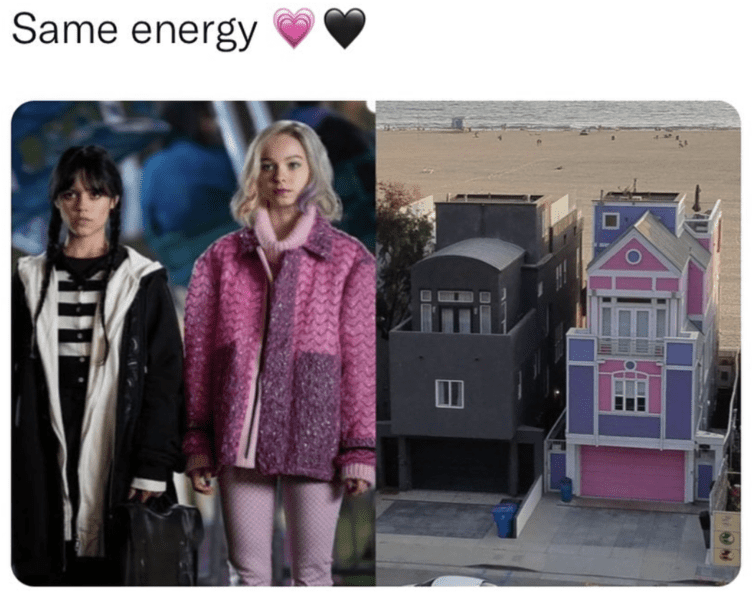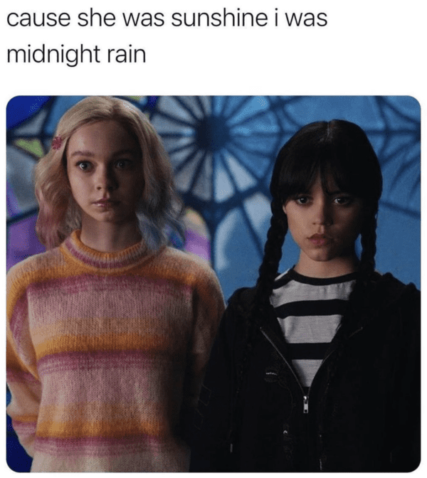 Another hilarious meme showing the aesthetic differences between best buddies Wednesday Addams and Enid Sinclair.