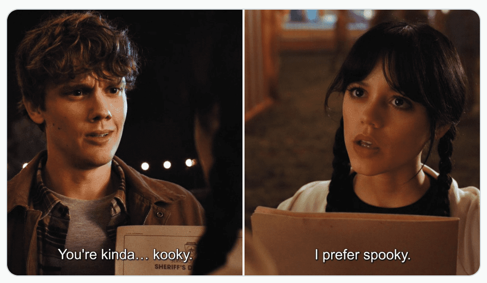This is a great scene from the series that also references the famous theme song from the original show. The chorus goes, “They’re creepy and they’re kooky/Mysterious and spooky/They’re all together ooky/The Addams family.” But as anyone who watched the show knows, Wednesday prefers the label spooky to kooky.