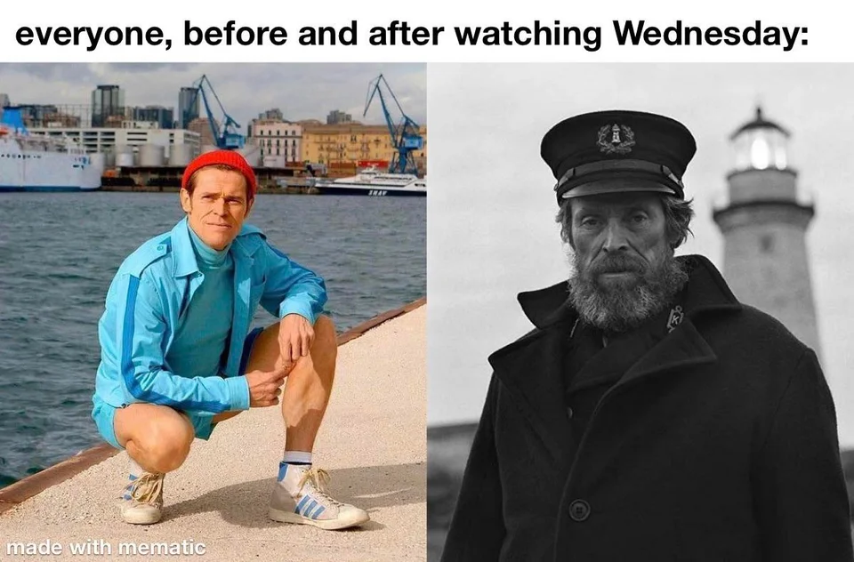 This meme uses Willem Dafoe to show what people are like before they watch Wednesday and after they watch the show. Very true to be fair.