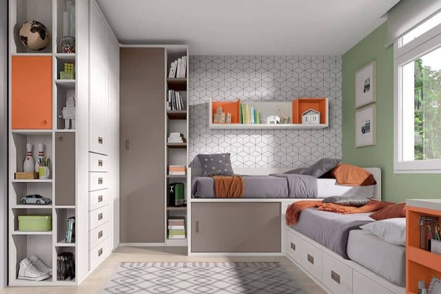 Kids' room with twin beds, under-bed storage, large wardrobe, and geometric wallpaper.