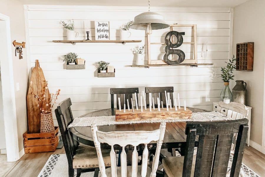 A farmhouse dining table should never feel stuffy, however. Mix antique and repurposed items to create a centerpiece that’s farmhouse fabulous.