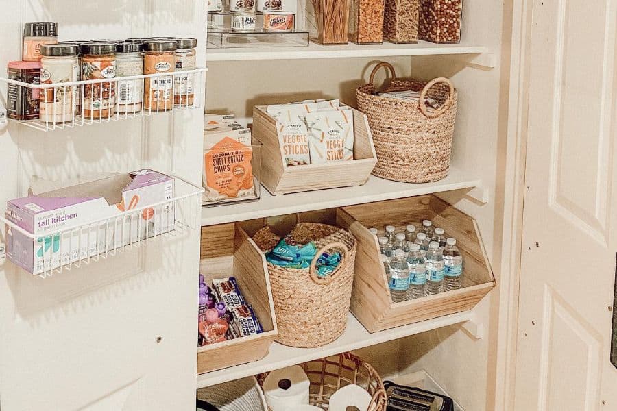 Baskets make excellent partners of wire shelving. Wire shelves are affordable and easy to install. However, they aren’t the best storage solution for small items. Baskets are great for hard-to-store items like chip bags, protein bars, and other individually wrapped foods.