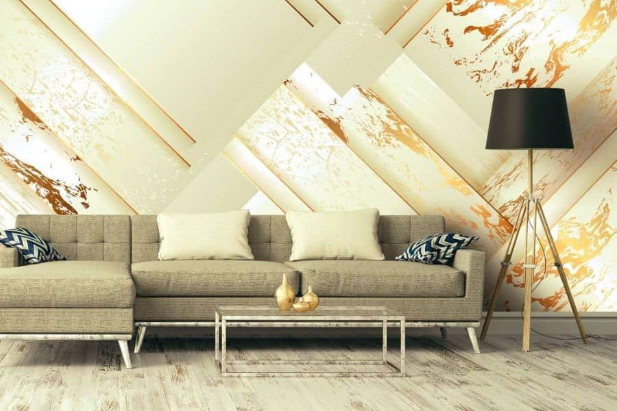 abstract wallpaper living room gray sofa black lamp