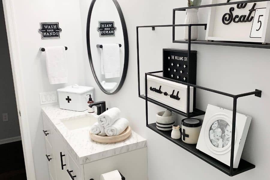 modern white bathroom with black accents