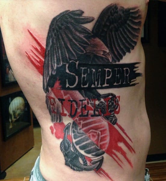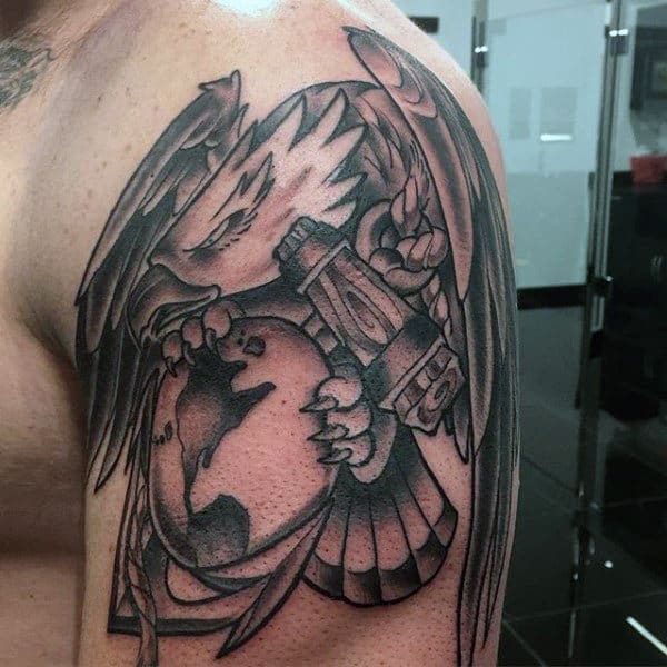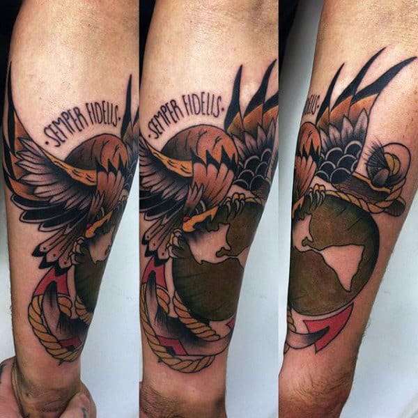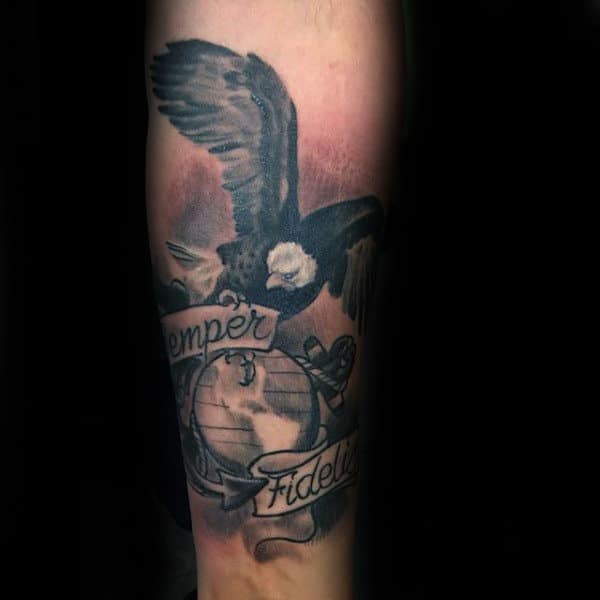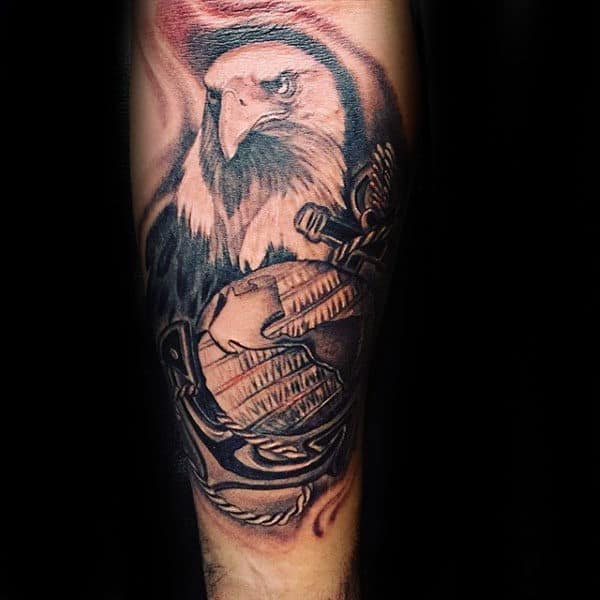 There happens to be a lot of powerful imagery that frequently appears in Marine tattoos. These authoritative symbols include eagles, weapons and American flags. Many of the illustrations are intended to pay respect towards fallen soldiers. Individuals commonly get this kind of ink while a beloved family member is currently serving overseas.