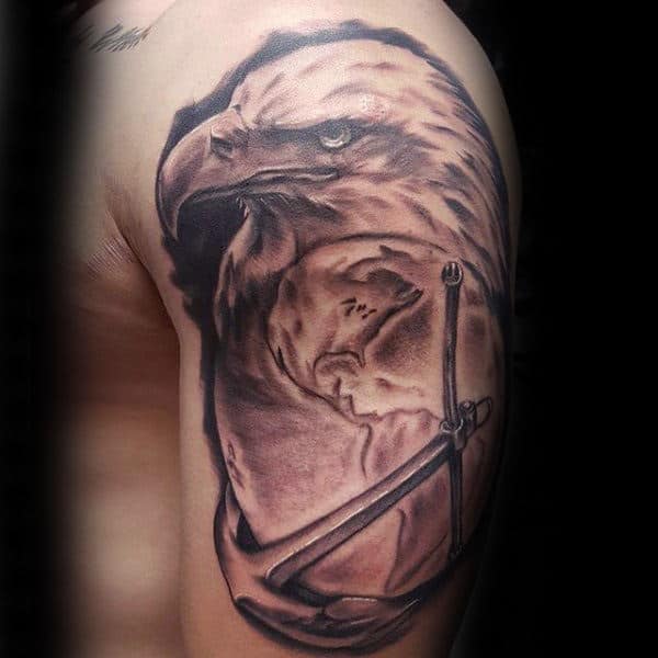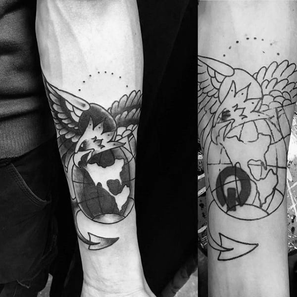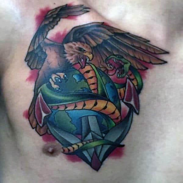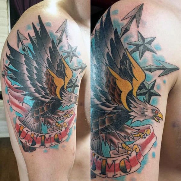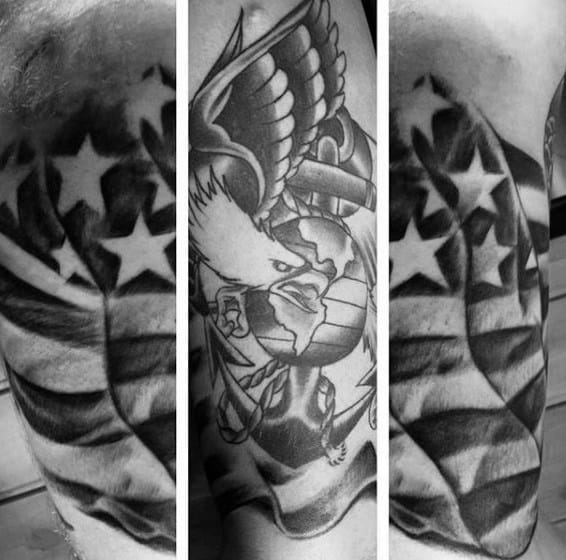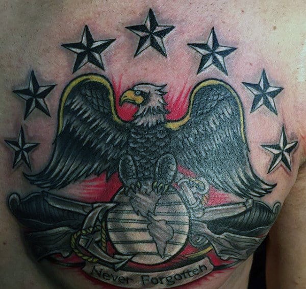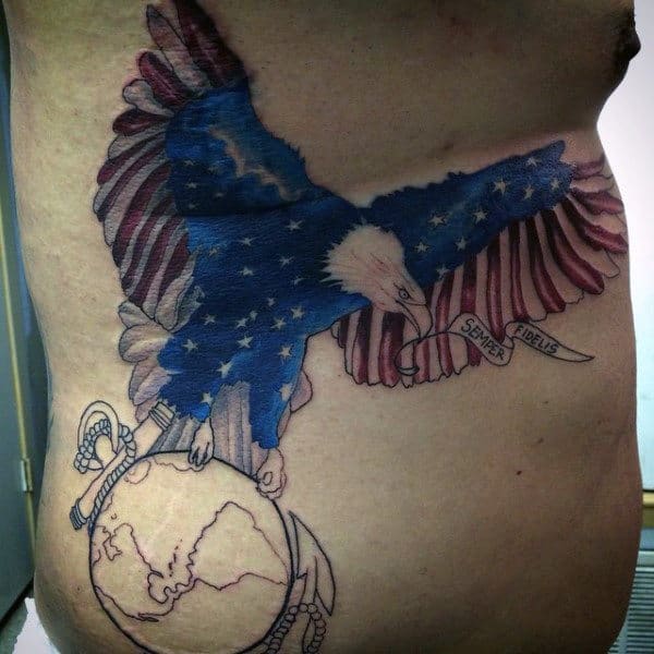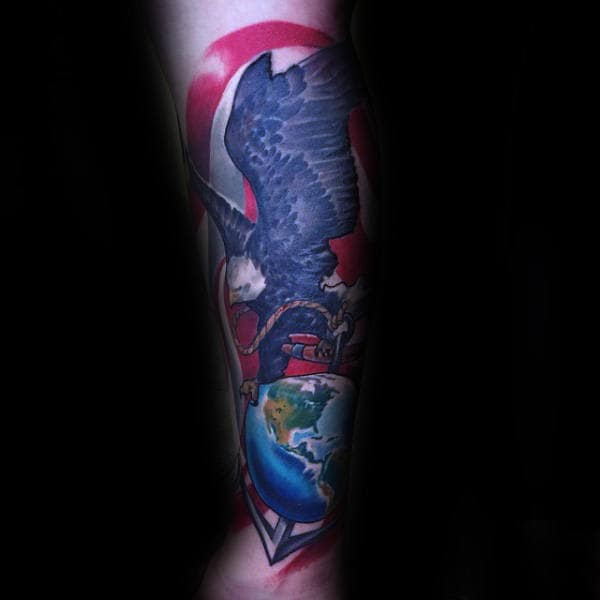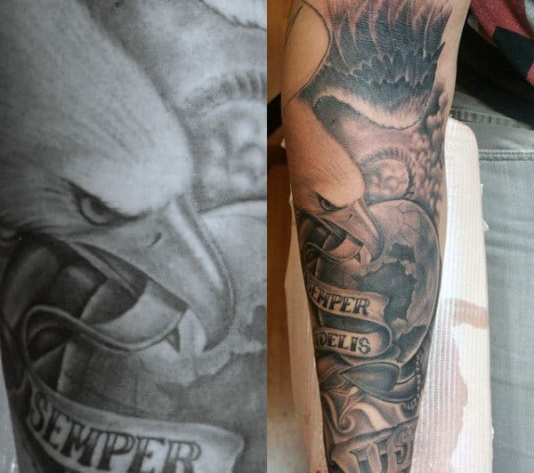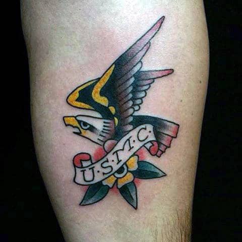 There’s definitely a trend towards highly stylized artwork depicting the eagle in as badass way as possible. A simple execution of the logo is powerful enough on its own in my opinion but it depends on what look you’re going for overall. Small changes to the logo include the addition of color (usually red and blue) and rendering it in 3 dimensions. If you want a simple USMC tattoo you can’t go wrong with a small logo. You can also use the Eagle to tie in with other themes of military allegiance and Americana.