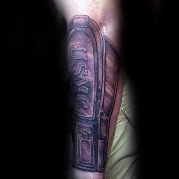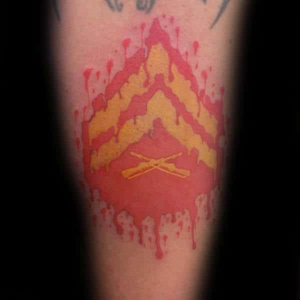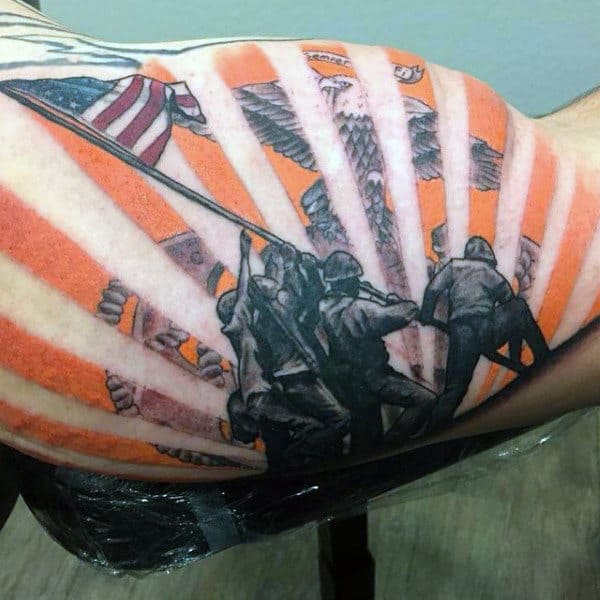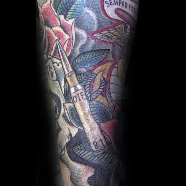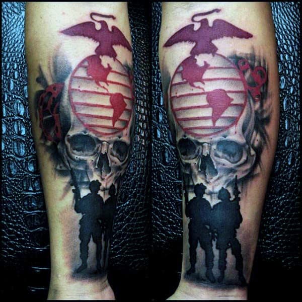 Using military imagery for your USMC ink throws the creative doors wide open. You’re giving your artist a lot of meat to work with here. Silhouetted soldiers raising the flag on Iwo Jima, knives, guns, shell casings are all versatile options conceptually and give great scope for individual interpretation.