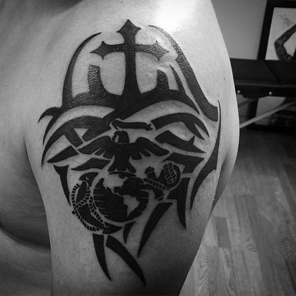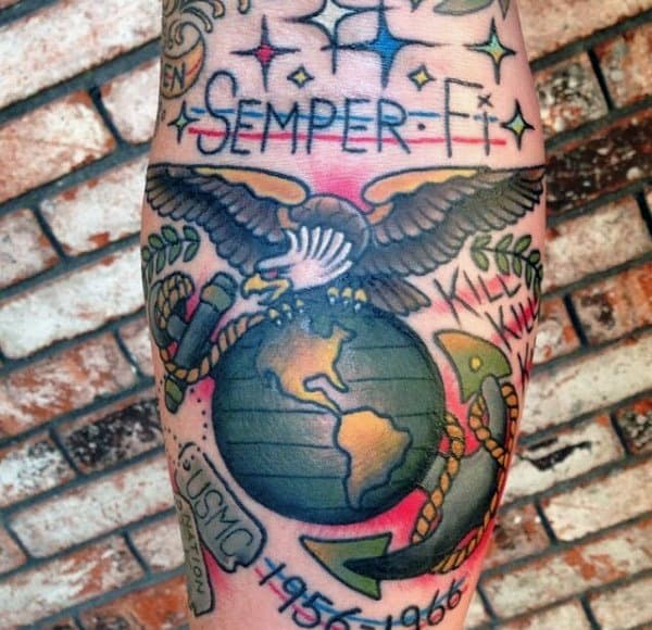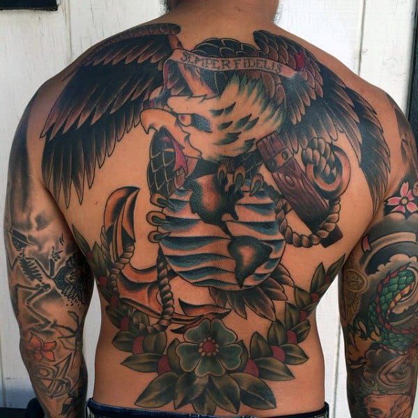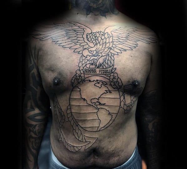 Some people really like to  make a statement with their tattoo. A large tattoo with a unifying theme can be immensely satisfying. With something like a USMC tattoo you could combine the logo, the motto, the American flag and military symbolism such as a soldier. Because these disparate elements complement each other in both their size and appearance, this combination looks complete rather than clunky.