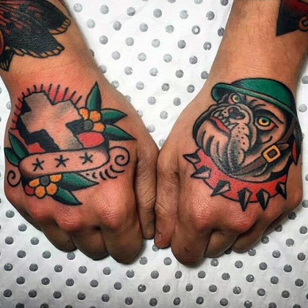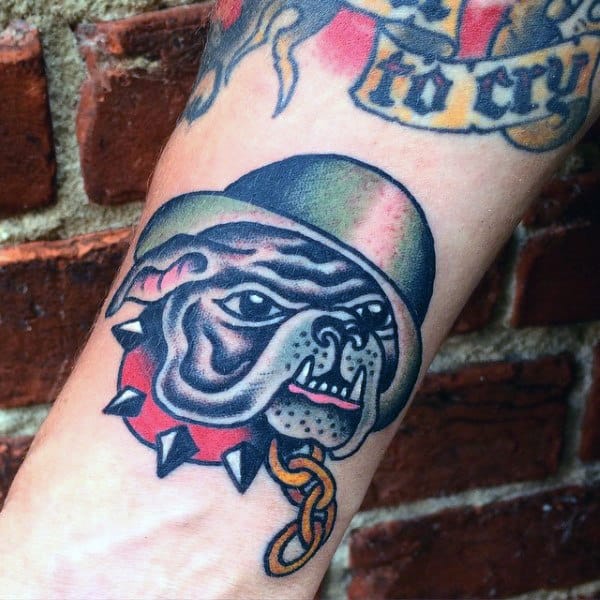 Stylistically a USMC bulldog tattoo lends itself to cartoon toughness. Some depictions have Chesty fleshed out into an actual soldier, but usually it’s a grimacing bulldog sporting an M1 helmet with spiked collar. The image lends itself well to American Traditional styling, while black and gray with heavy shading is also popular. Not many choose to go for realism in representing the mascot so bold outlines and a limited color palette is the norm.