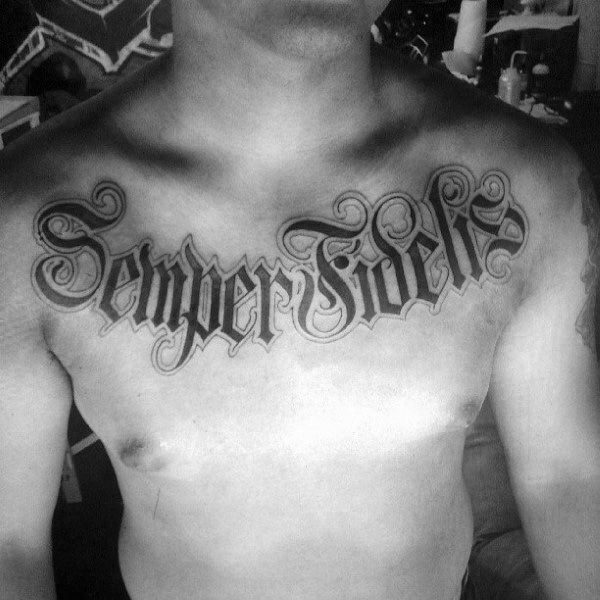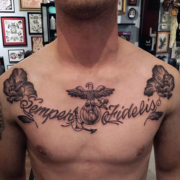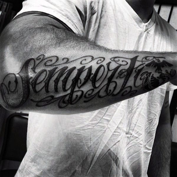 The USMC motto “Semper Fidelis” or “Semper Fi” meaning always loyal, or always faithful, is a perennial favorite for USMC ink. It’s simple and the words speak for themselves, both in their literal meaning and through their association with the Corps.