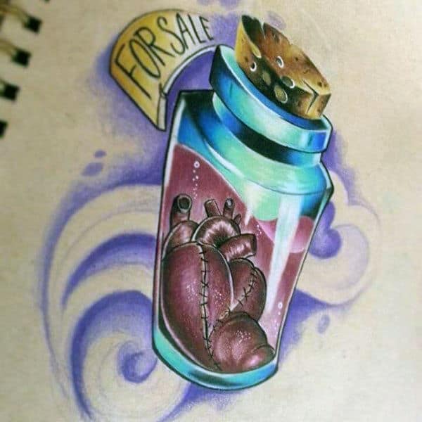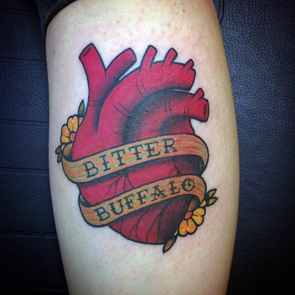 Colorful anatomical heart tattoos will always present a lot of options, but you can’t go wrong with classic blood red. Blood red anatomical heart tattoos embellish the fleshy feel of a heart. The classic countering of blue is also an additional flavor to add, but you can’t go wrong with the more natural color of them all.