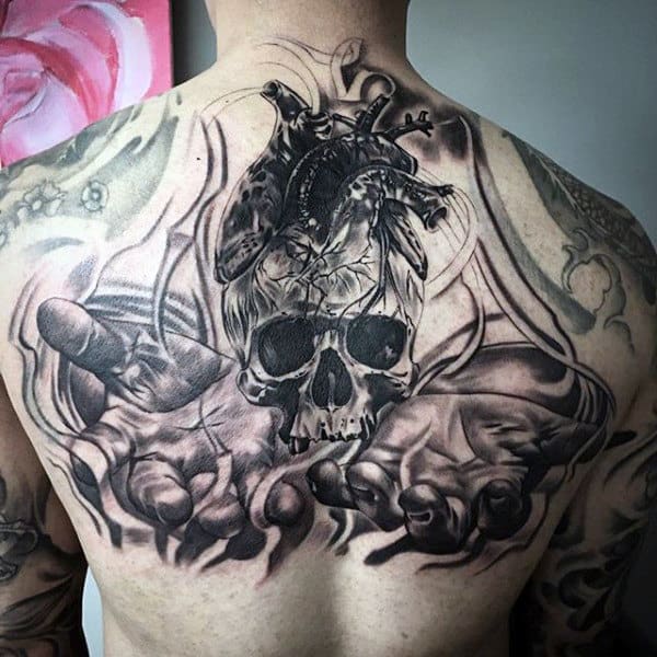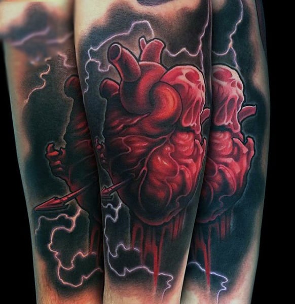 A chest piece is an ideal place for a heart tattoo. Whether you want to anatomically correct with your anatomical heart chest piece, or go down a metaphoric route like the third piece pictured, you’ll have the luxury of a lot of space to work with. The second piece shown is an especially great example of a torn skin piece, that gives the tattoo an especially 3-dimensional feel. You also have a lot of options for different side ornamentation with skulls or roses to add another layer of intricacy to your anatomical heart chest tattoo.