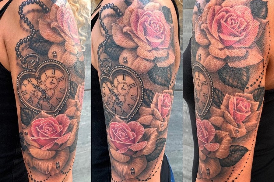 Arm tattoo featuring rose flowers and a vintage pocket watch with detailed beadwork design