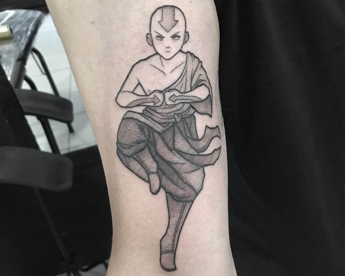 Tattoo of Aang from Avatar: The Last Airbender in a meditative pose, focusing his energy