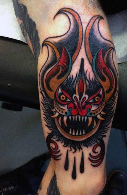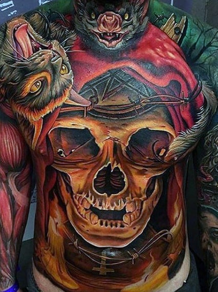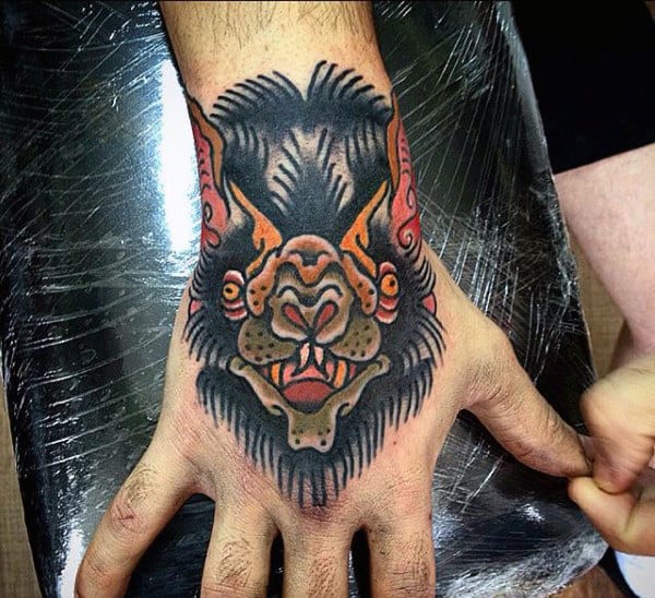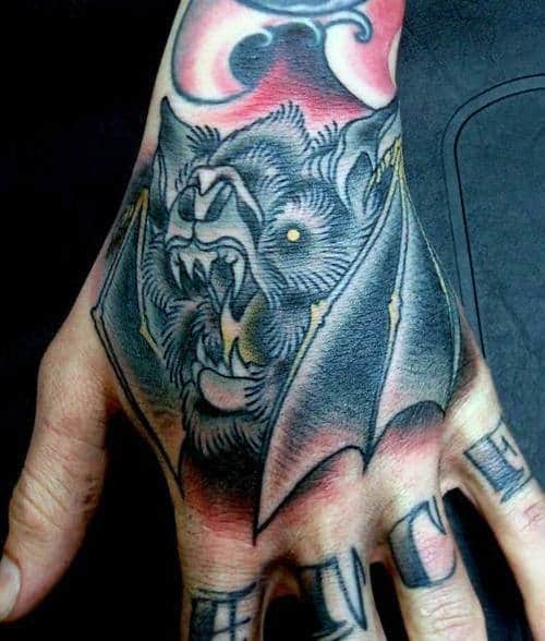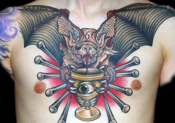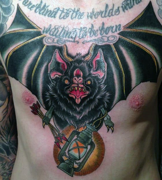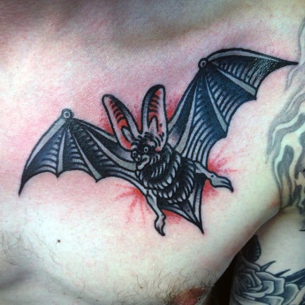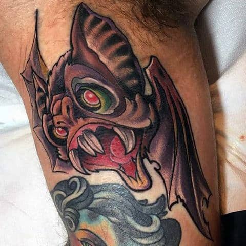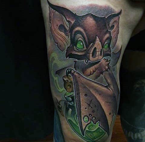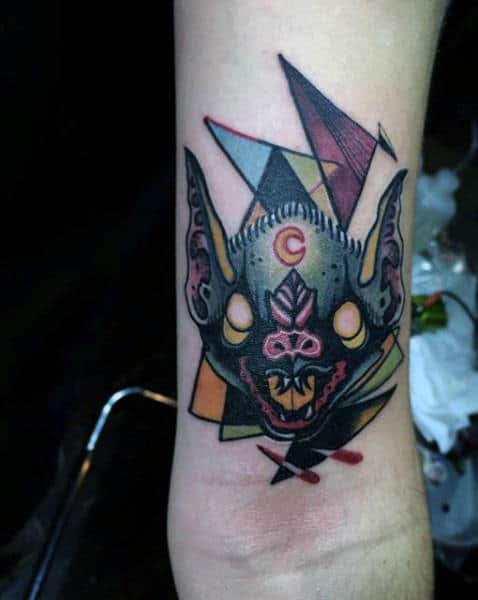 Tattooing is about expression and innovation. In new school designs the absurd, the cartoonish, the bold, and the imaginative are front and center Any style of tattoo can cut to the core of who you are and what you want to say but few are as eye-catching as new school with its vibrant color palette. If you’re the kind of person who likes their ink admired from across the room, these bat tattoos are the ones to do it.