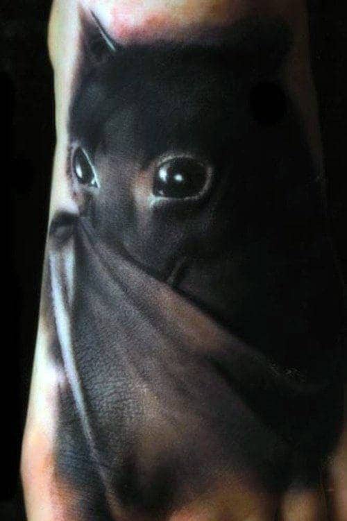 A good realism bat tattoo can play in full color or black and grey. Understanding your light source and shading is important to making this style pop and can save it from fading. The goal here is to capture life as it really is. Fine detail, proper proportion, and an eye to for ink placement which conforms to the movement of your body combats distortion. Your goal is to avoid having that realism stripped away from the finished piece and leave you with a true-to-life image, like the black and gray foot piece above .