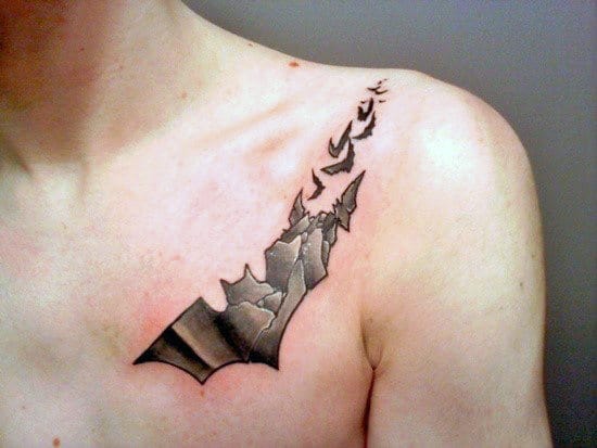 Bats are enigmatic creatures. Why should your bat tattoos be different? An abstract design lets you shrug off the confines of realism and traditional ink to have fun with a bat tattoo that could be surreal, geometric, distorted, or dream-like. The surreal elements make them memorable regardless of the basic styles or interplay of colors. Whether you’re looking for black and grey, rich colors, or a solid mixture of each, going abstract lets you take advantage of body placement and innovation in ways other styles won’t. Abstract lends itself best to truly artistic techniques like dotwork, watercolor, geometric design, and full-on cartoon where rules are made to be broken and reality no longer applies.  Check out the Batman-inspired piece for a prime example of how an effective tattoo can be constructed from dream-like, or even nightmarish, elements.