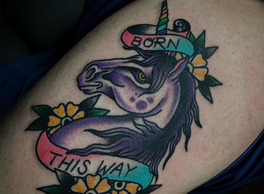 Gaga got her Born This Way tattoo unicorn tattoo before the single and albums were released in 2011. The design itself is a simple American traditional classic melding script and American traditional bold lines.