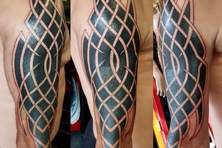 A detailed Celtic tribal sleeve tattoo that begins at the shoulder and extends down to the wrist